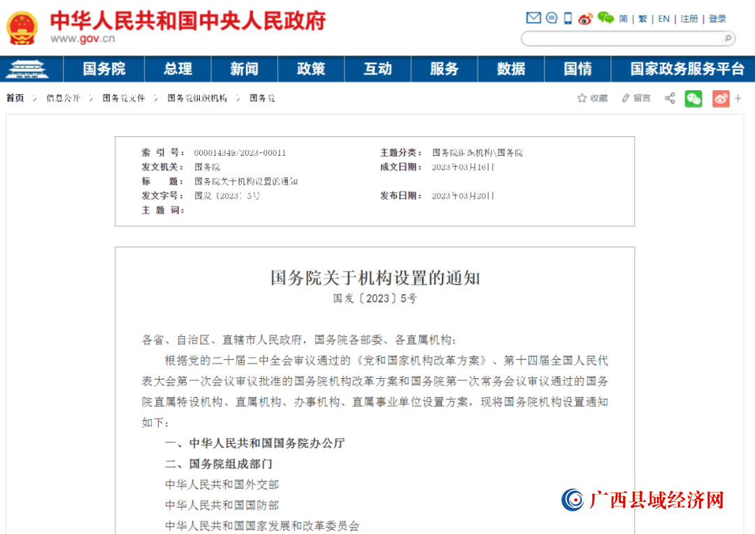 根据党的二十届二中全会审议通过的《党和国家机构改革方案》、第十四届全国人民代表大会第一次会议审议批准的国务院机构改革方案和国务院第一次常务会议审议通过的国务院直属特设机构、直属机构、办事机构、直属事业单位设置方案,现将国务院机构设置通知如下: